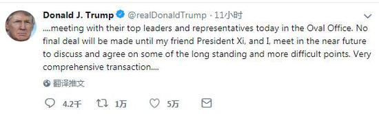 “只有在我的朋友习主席和我在不久的将来会面讨论,就一些长期存在和更难的问题达成一致意见后,才会达成最终协议,”特朗普1月31日在一条推文中表示,“中方代表和我正在努力达成一项完整的协议,把谈判桌上的所有问题都解决掉。”